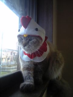 正月になったら猫バージョンの年賀状(この他に親戚用のまともなヤツとデザインに凝ったバージョンと毎年三種類作ってるのよ〜)はここにアップしますが、その元写真の一部であるチャイくんの鳥のコスプレ写真を掲載します。
